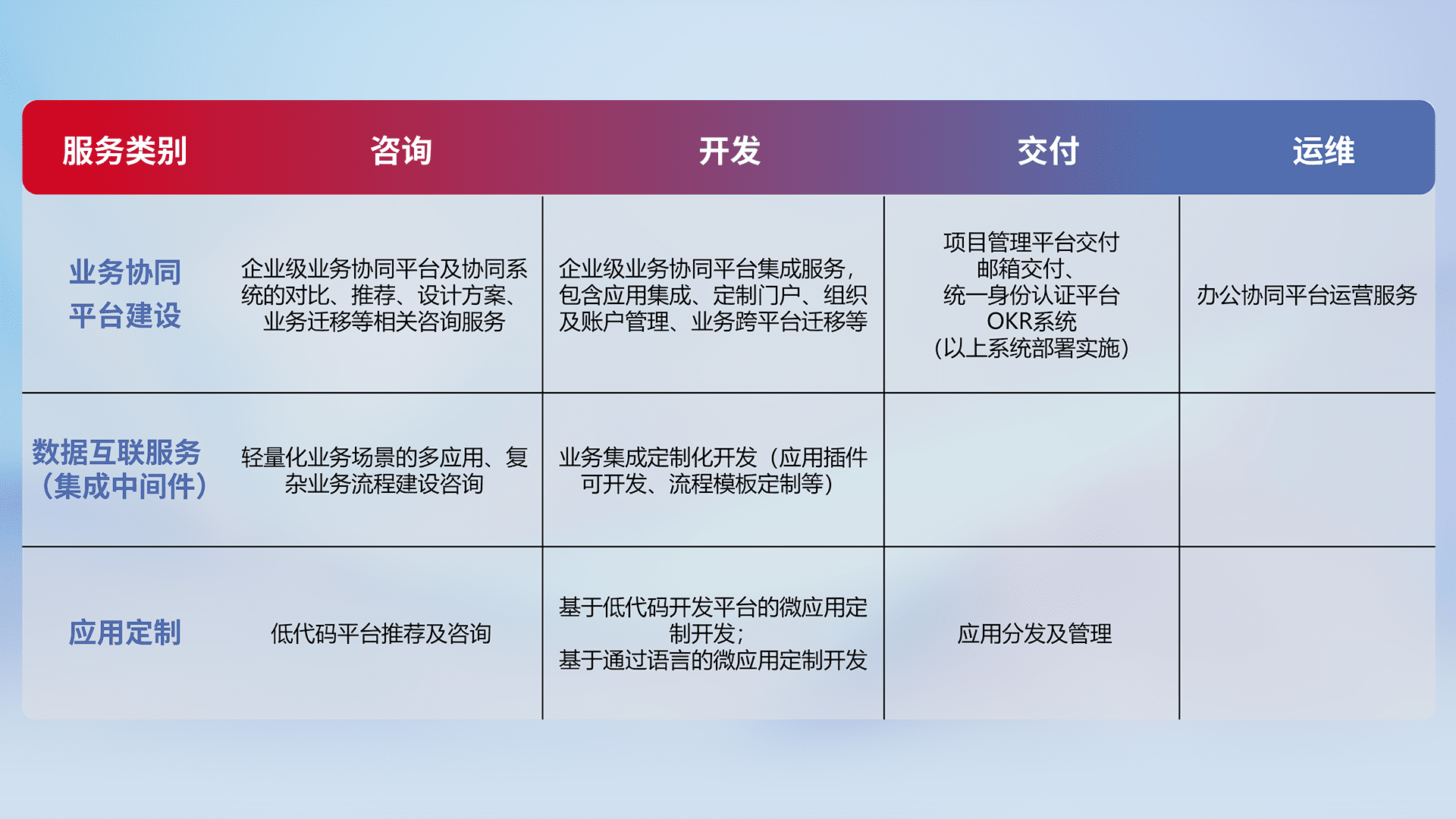 针对钉钉、、、企微、、、、IDaas等平台级产品提供产品的规划、、、方案、、、交付、、定制化开发等服务,,实现如统一协同办公、、、、智能客户服务、、、、混合会议管理、、、、智能数据查询、、、、等业务场景,,实现数字化转型。。