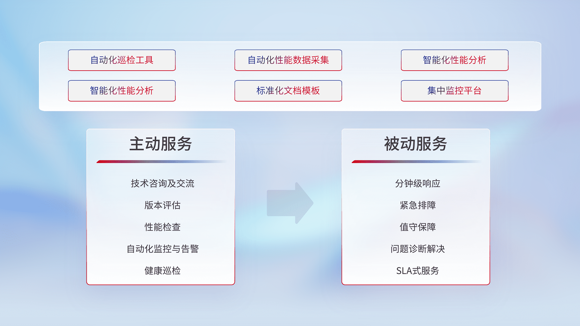 智能化工具和标准化文档,,,保障服务质量,,,提供主动服务(包含技术咨询、、版本评估、、性能检查、、自动化监控与告警、、健康巡检)和被动服务包含(分钟级响应、、紧急排障、、值守保障、、问题诊断解决、、、SLA服务)。。。